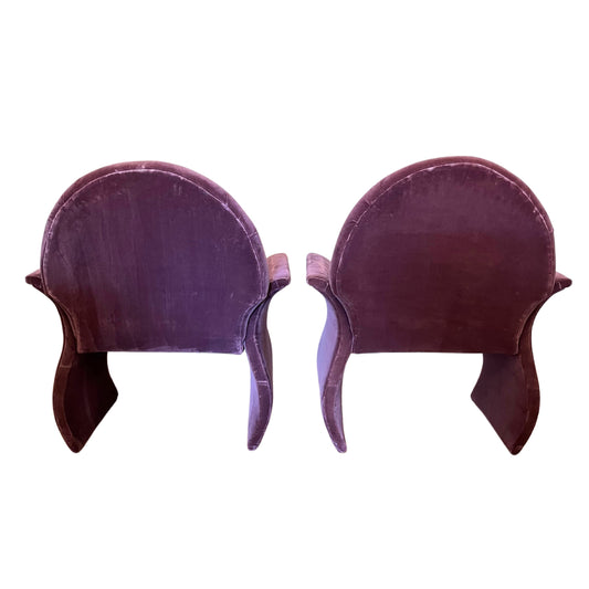 Pair of 1980s Postmodern Curved Arm Lounge Chairs, Purple Velvet