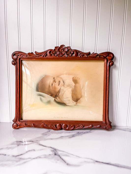 Vintage Hand Carved Floral Wood Frame with Convex Bubble Glass 1930's