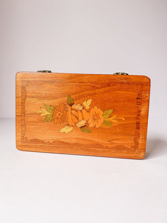 Vintage Inlaid Wood Floral Jewelry Box with Orange Fabric