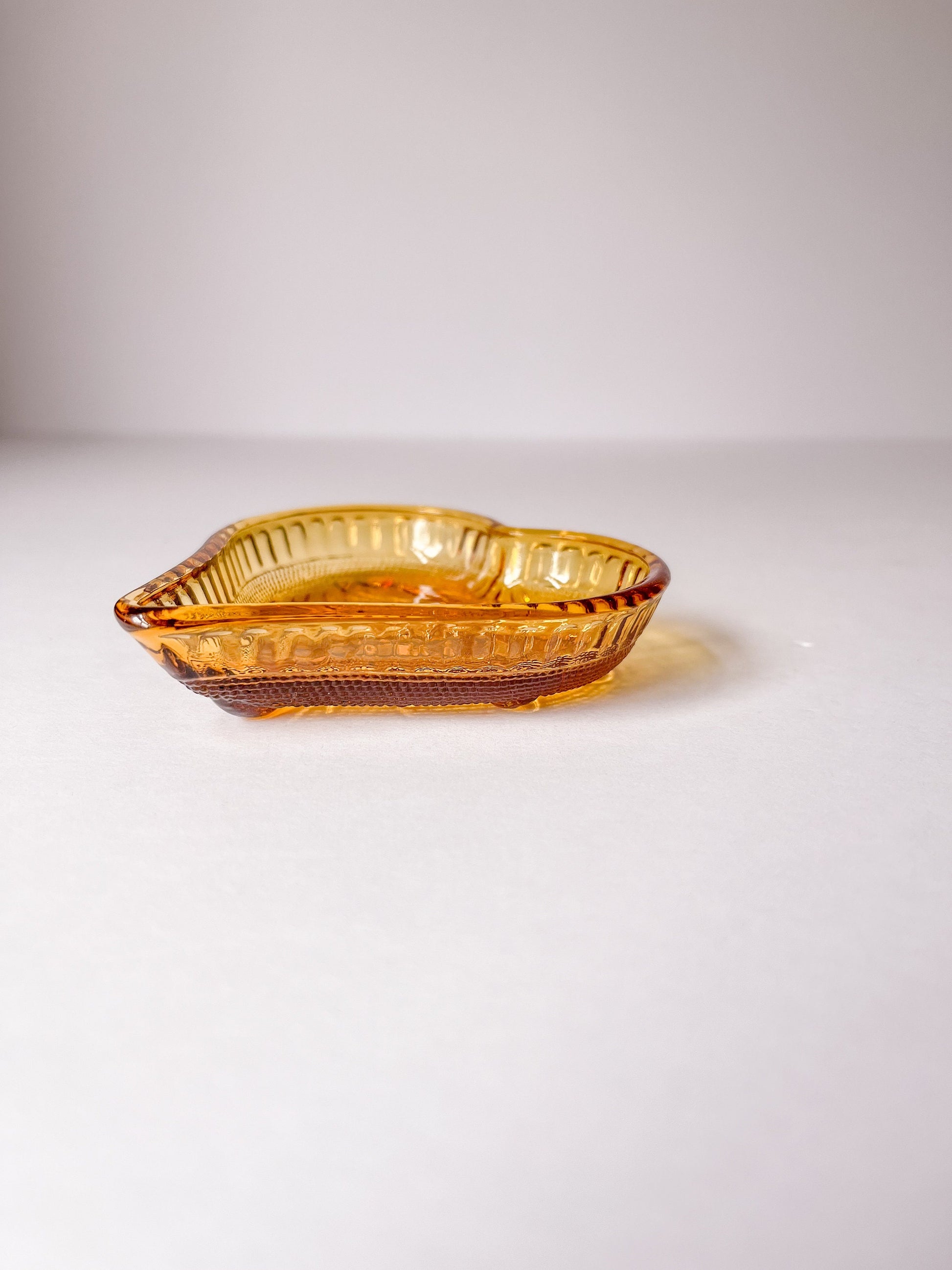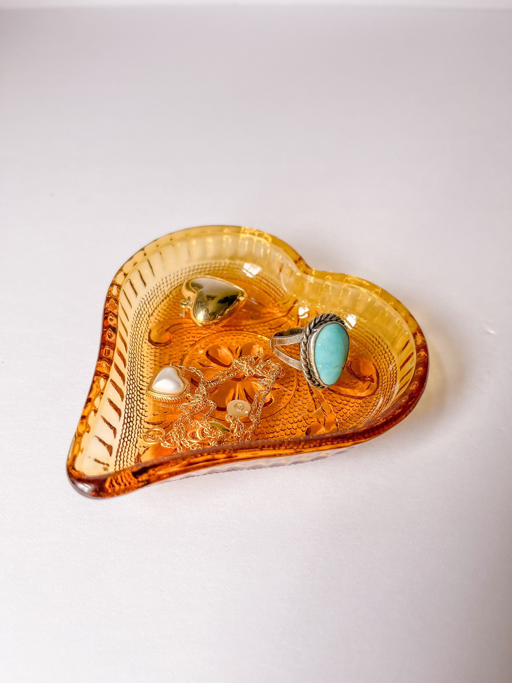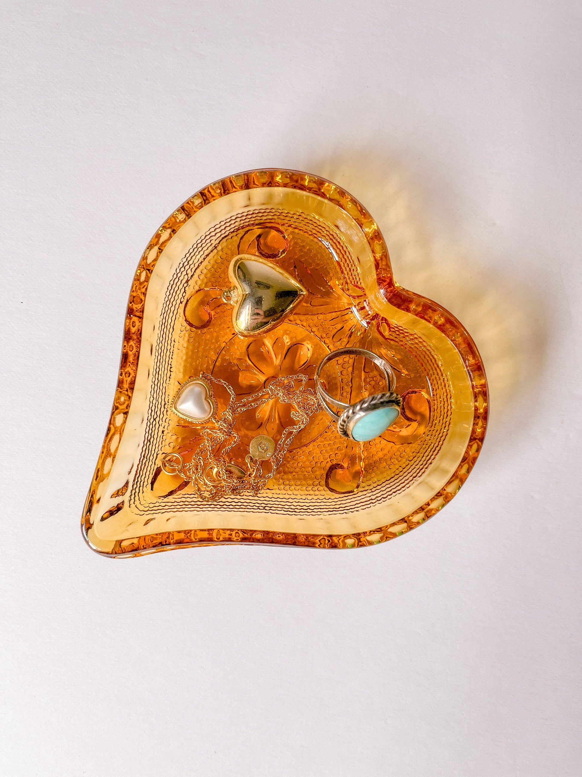 The perfect ring or earring dish. This vintage amber glass heart trinket dish has the most beautiful texture and floral detailing. Measures 3.75” L X 3.5”W X .75” H