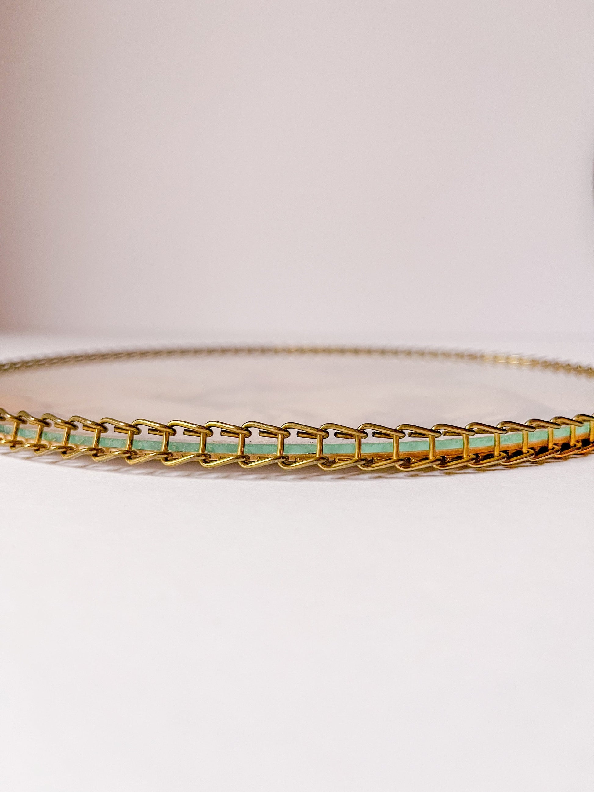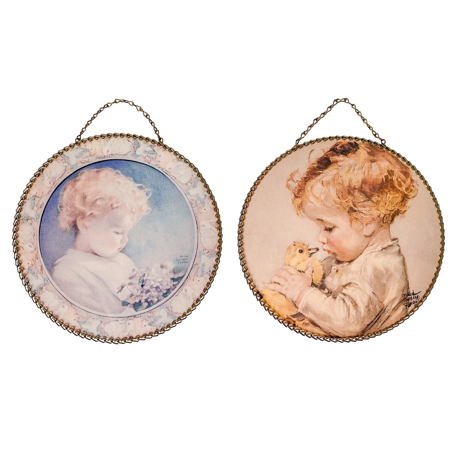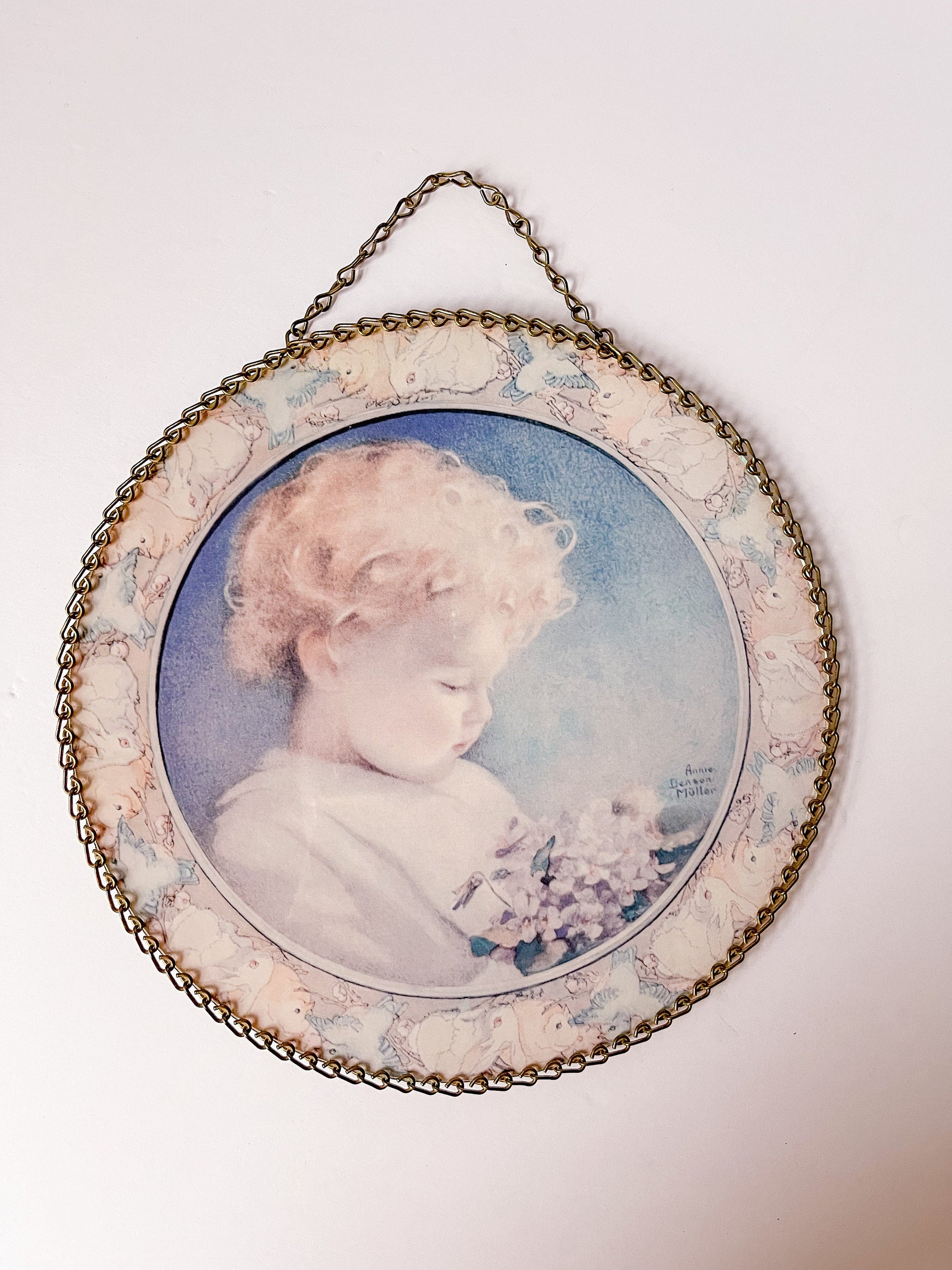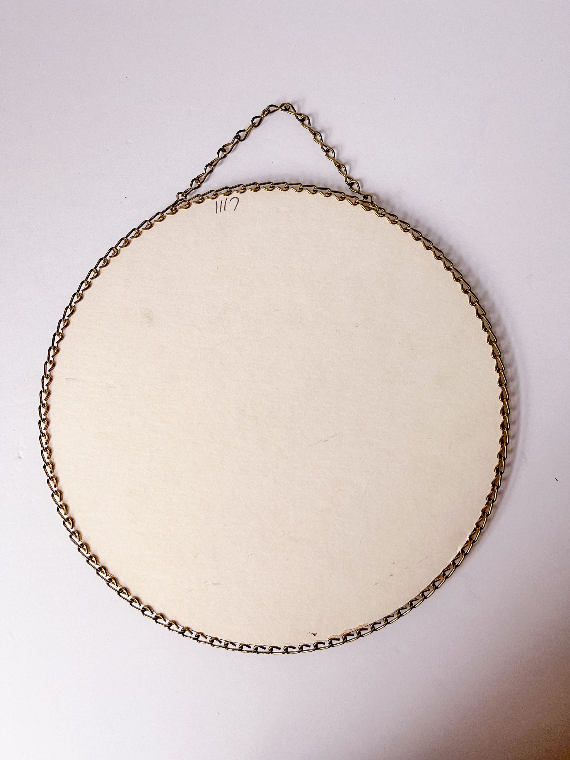 These were originally used in homes heated from oil, wood or coal stoves. Flue openings were not very attractive and these were used to decorate the room while covering the unattractive holes. There is a printed image under the glass that can exchanged for an image of your choosing. Very interesting chain outline keeping the glass in place. They measure 9.25” D X .25” H