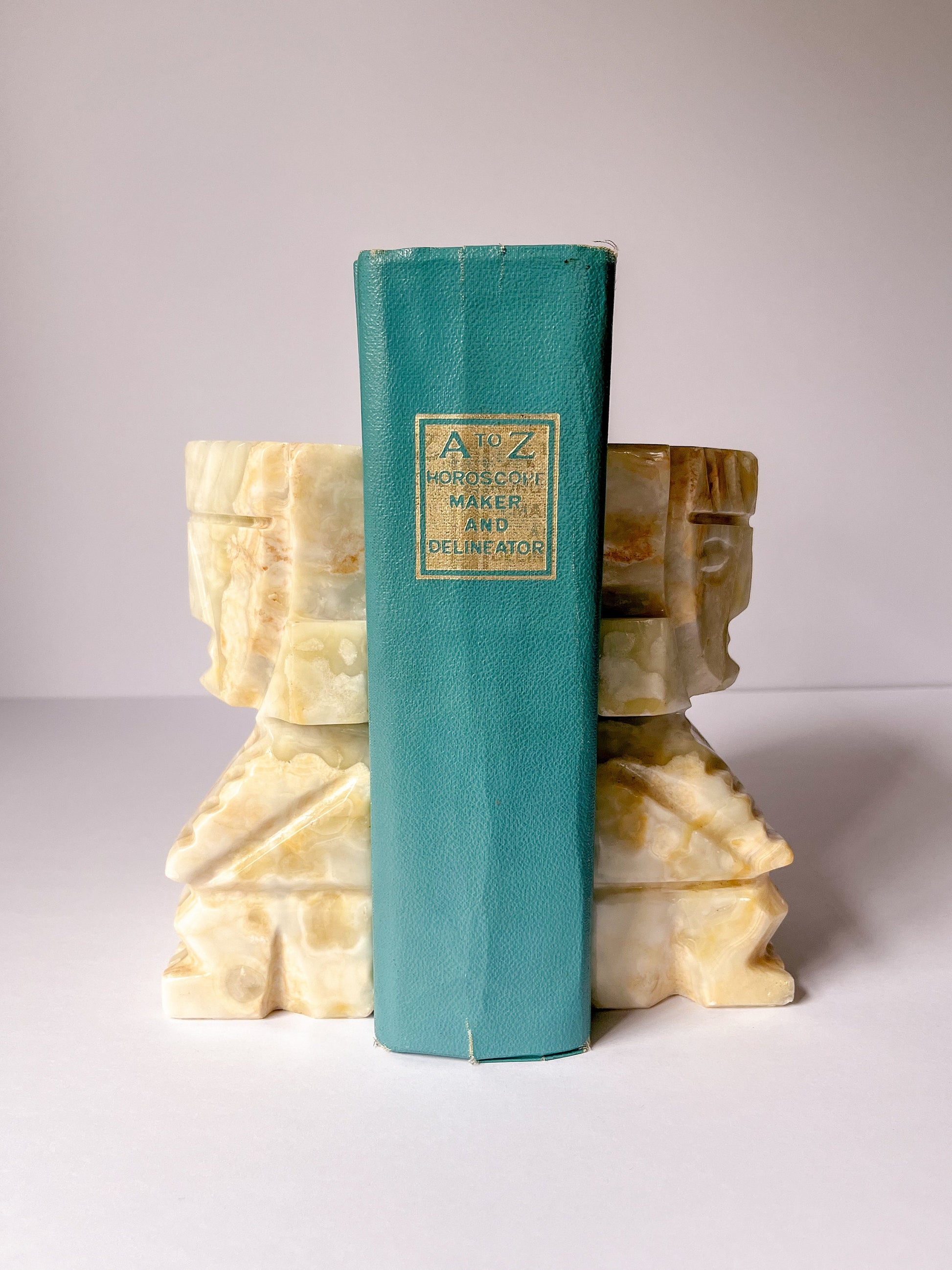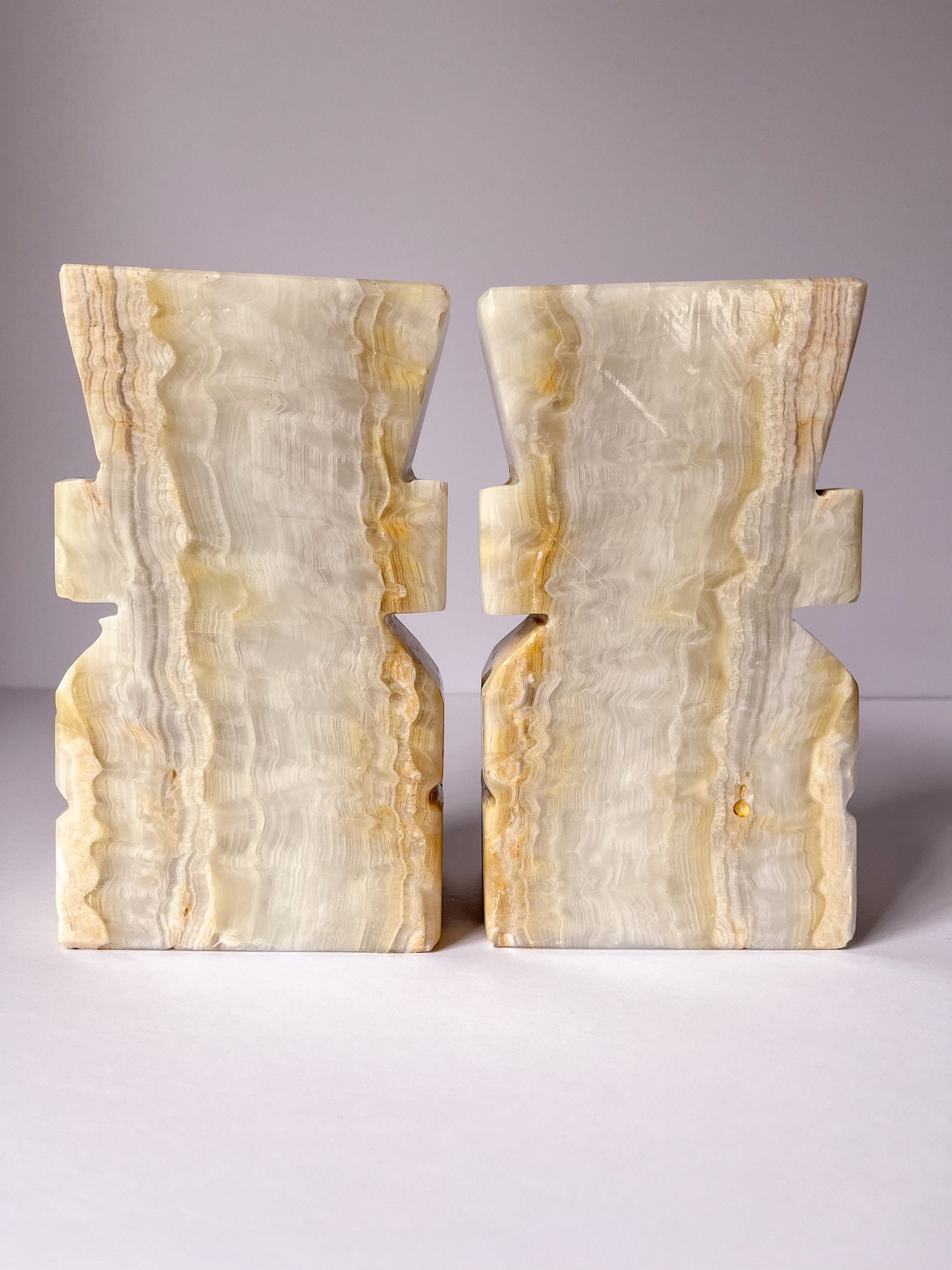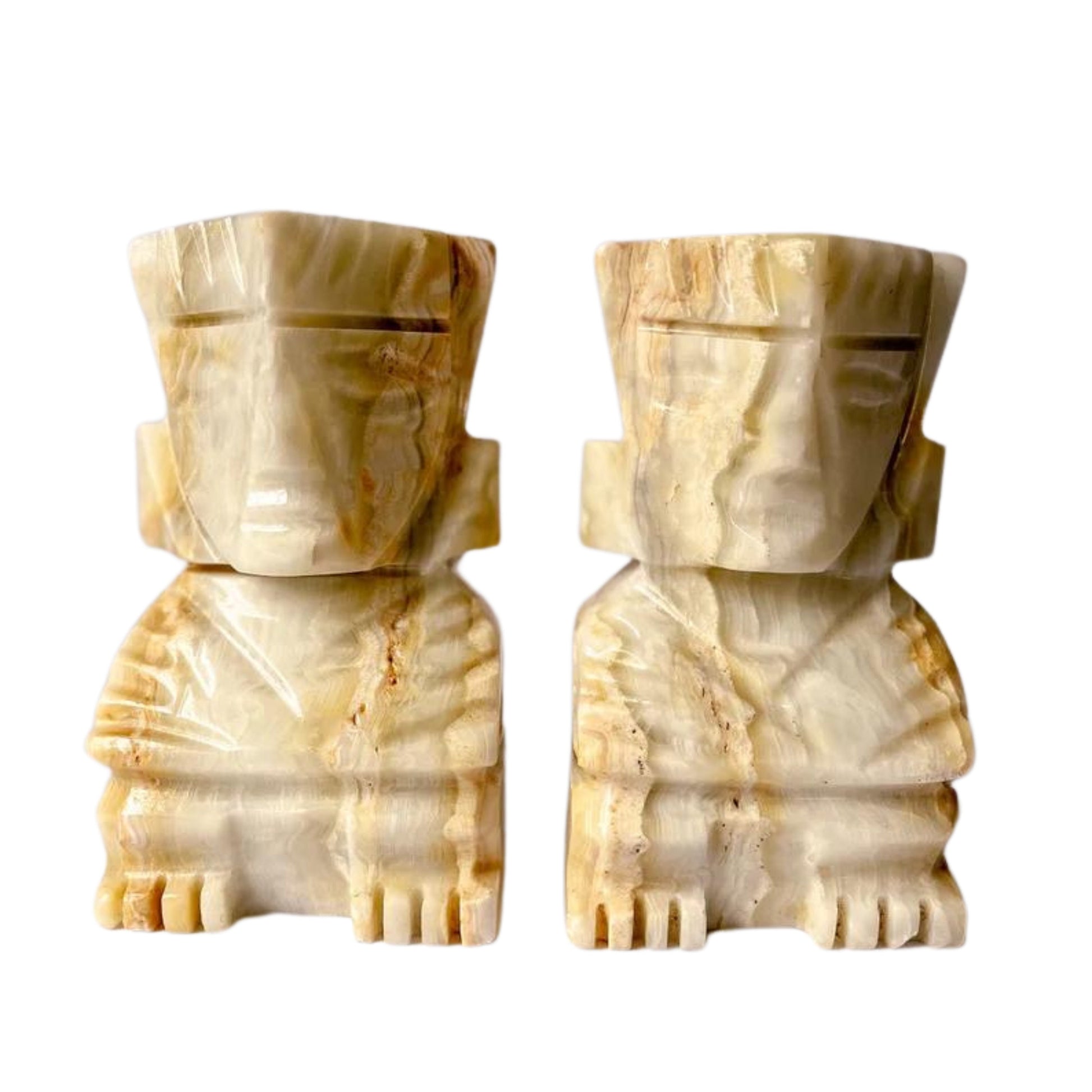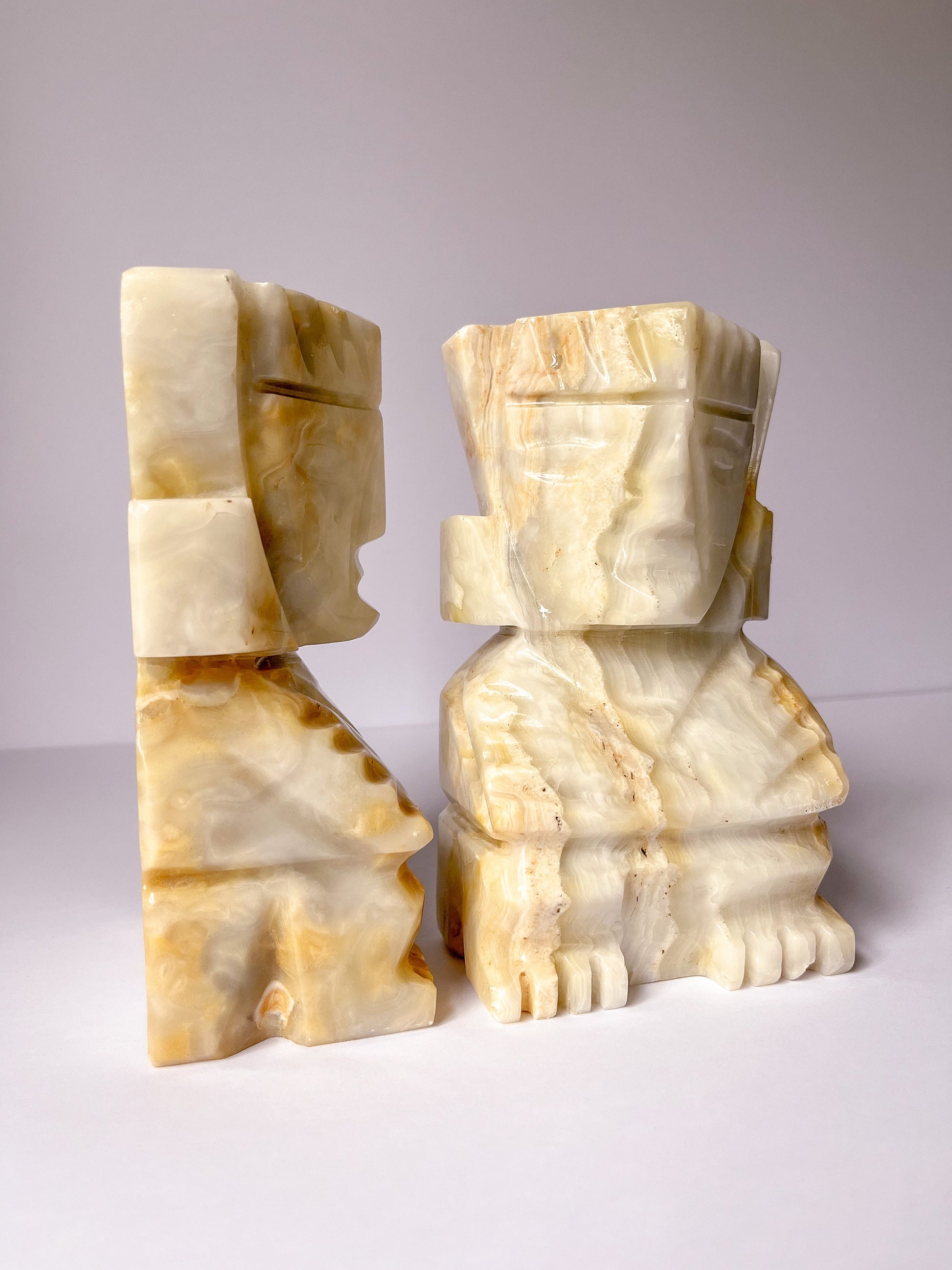 Gorgeous pair of mid century onyx marble hand-carved Aztec, tiki, Mayan bookends.