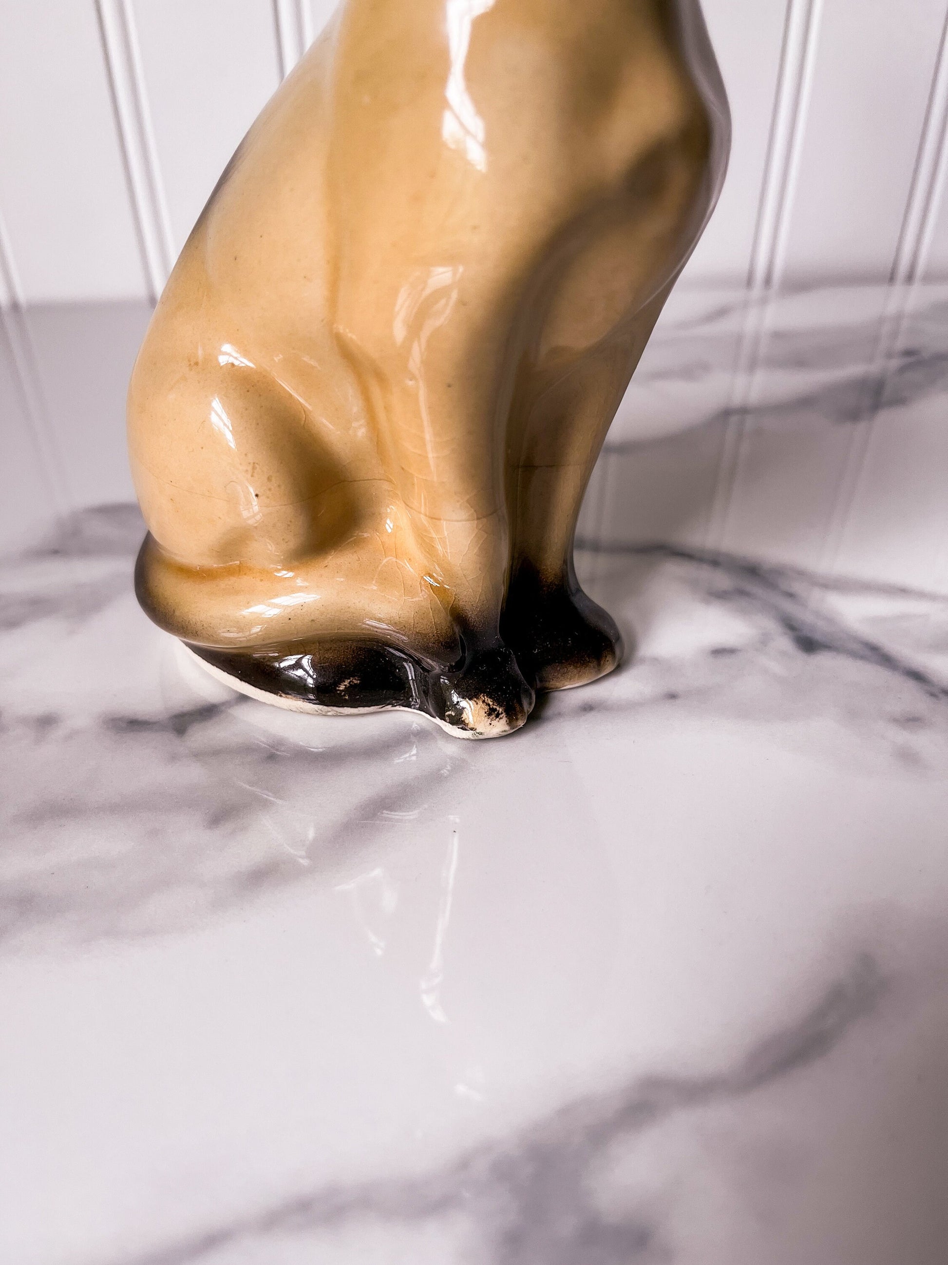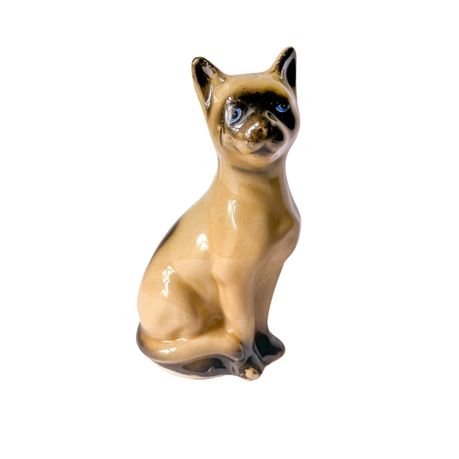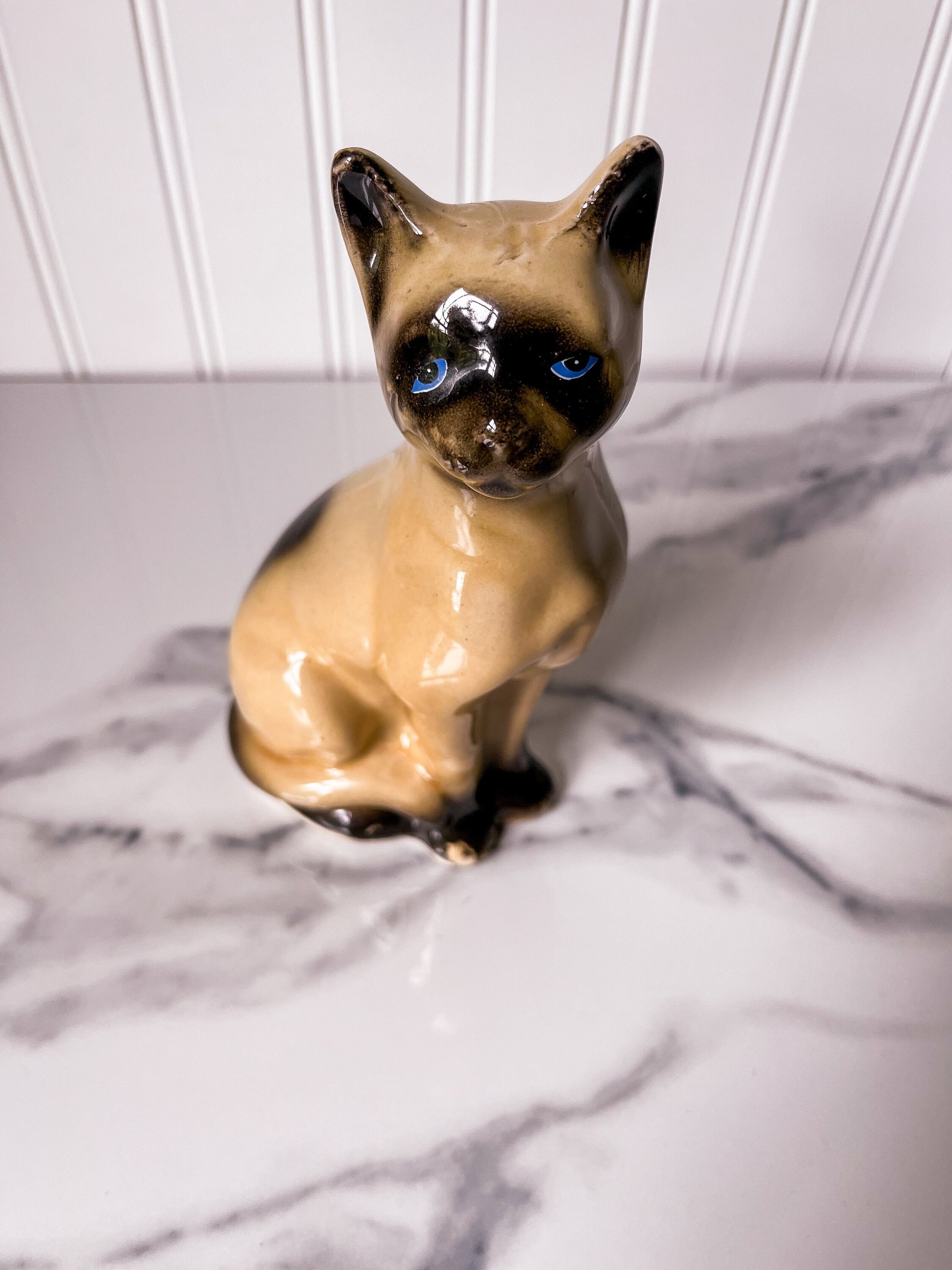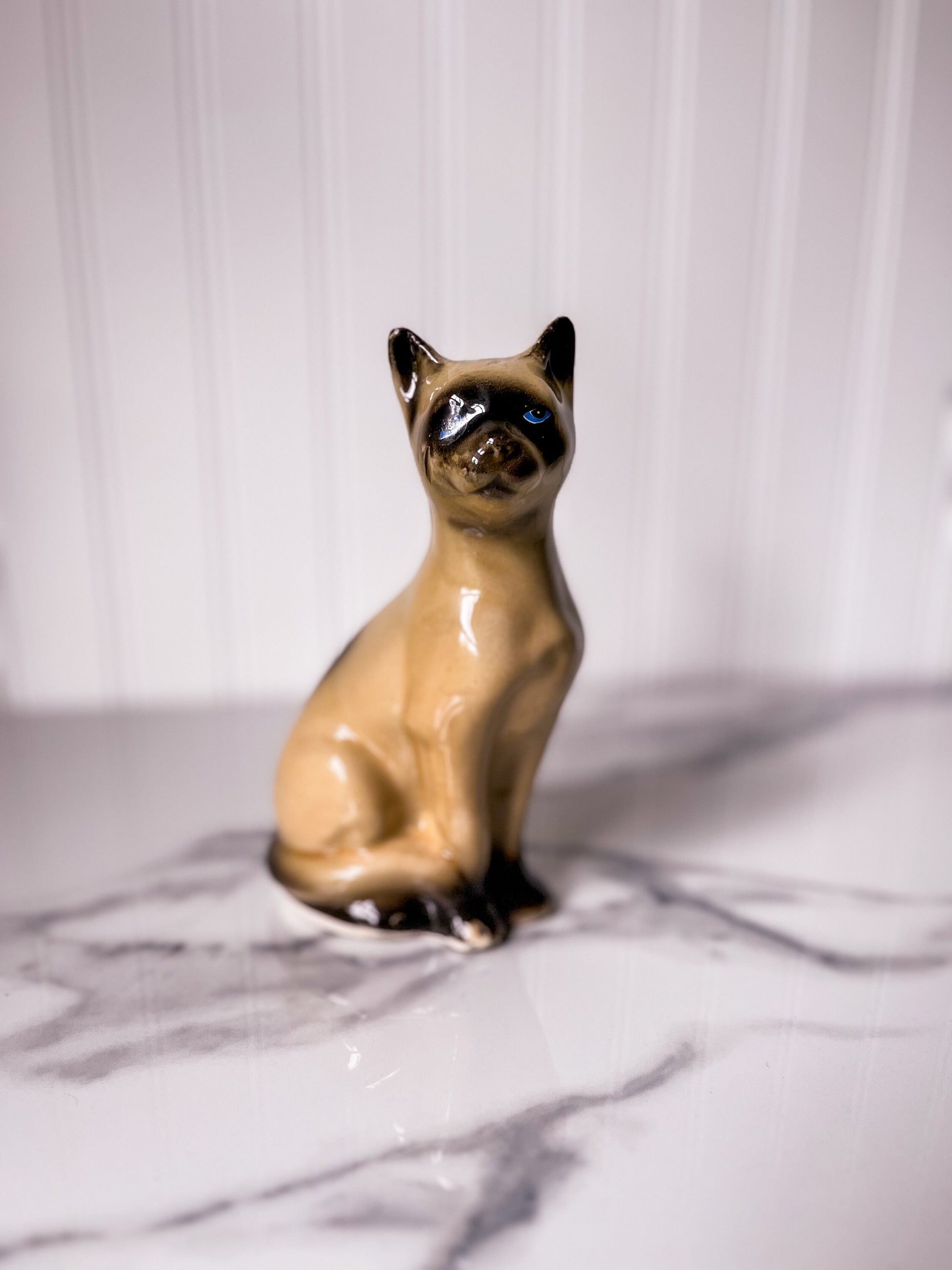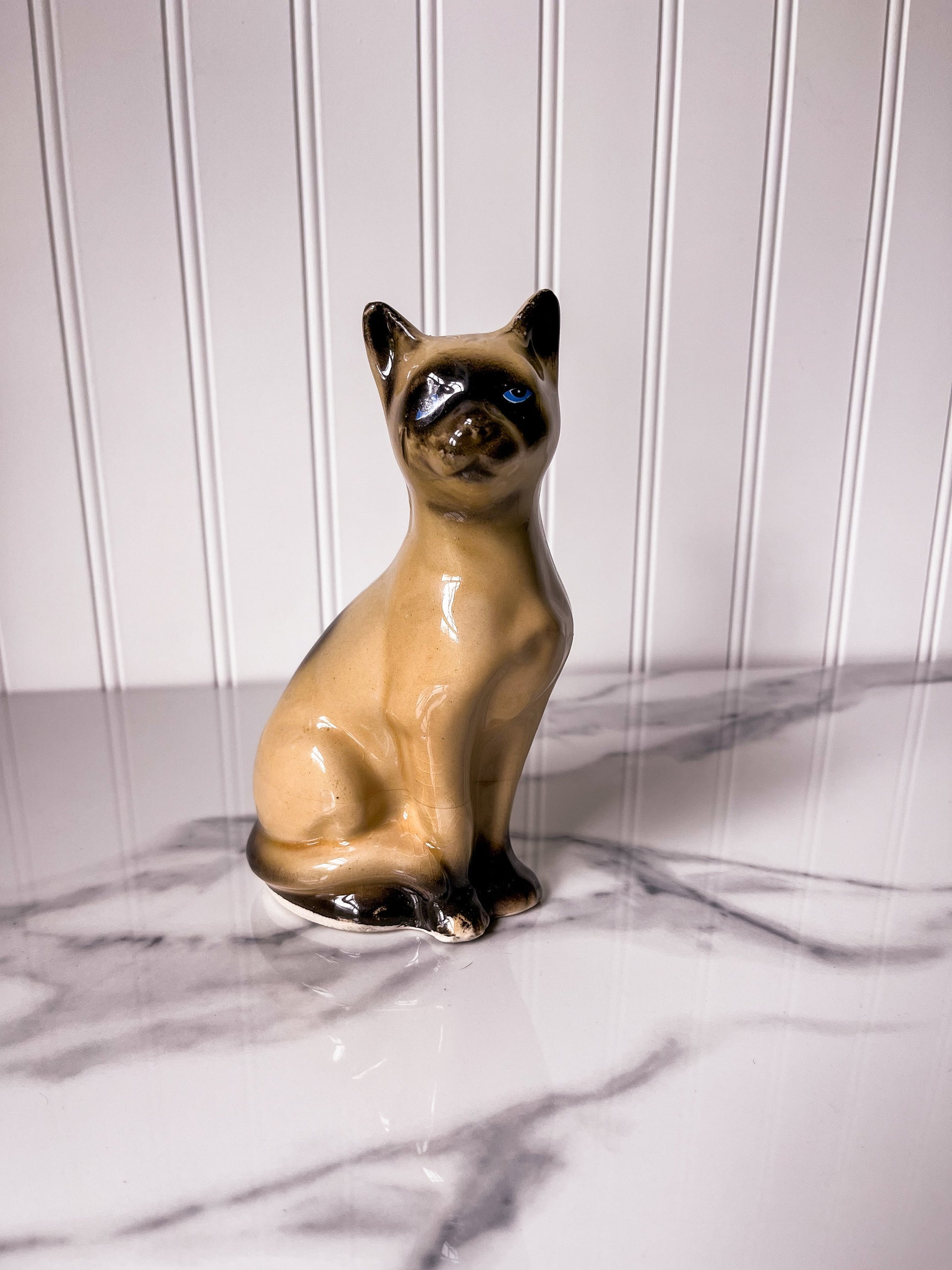 Super cute vintage porcelain Siamese cat figurine. Made in Brazil. In good vintage condition. Would look good on a bookshelf stacked on some books! It measures 4” W x 6.25” H