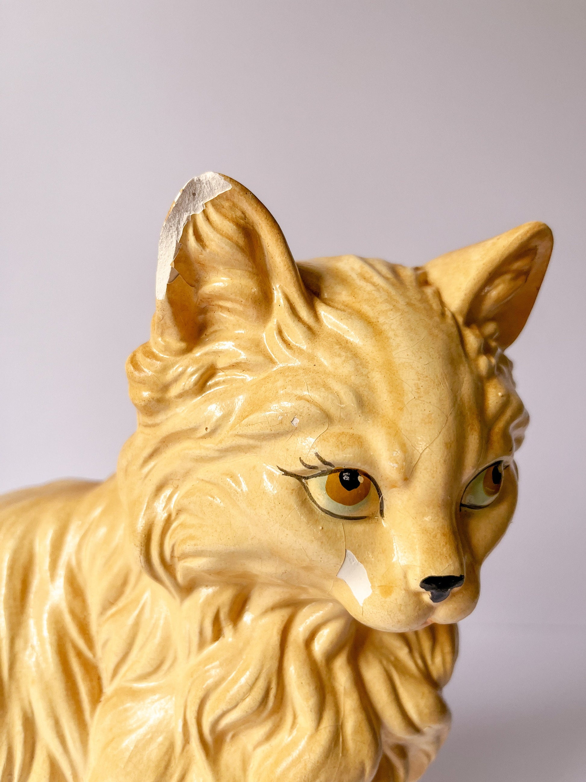 The charm of it- the age and the wear. You can tell it’s lived a life of its own! It is chipping in a few spots- mainly the face and ear. I have included photos of every angle. It is in very fragile condition.